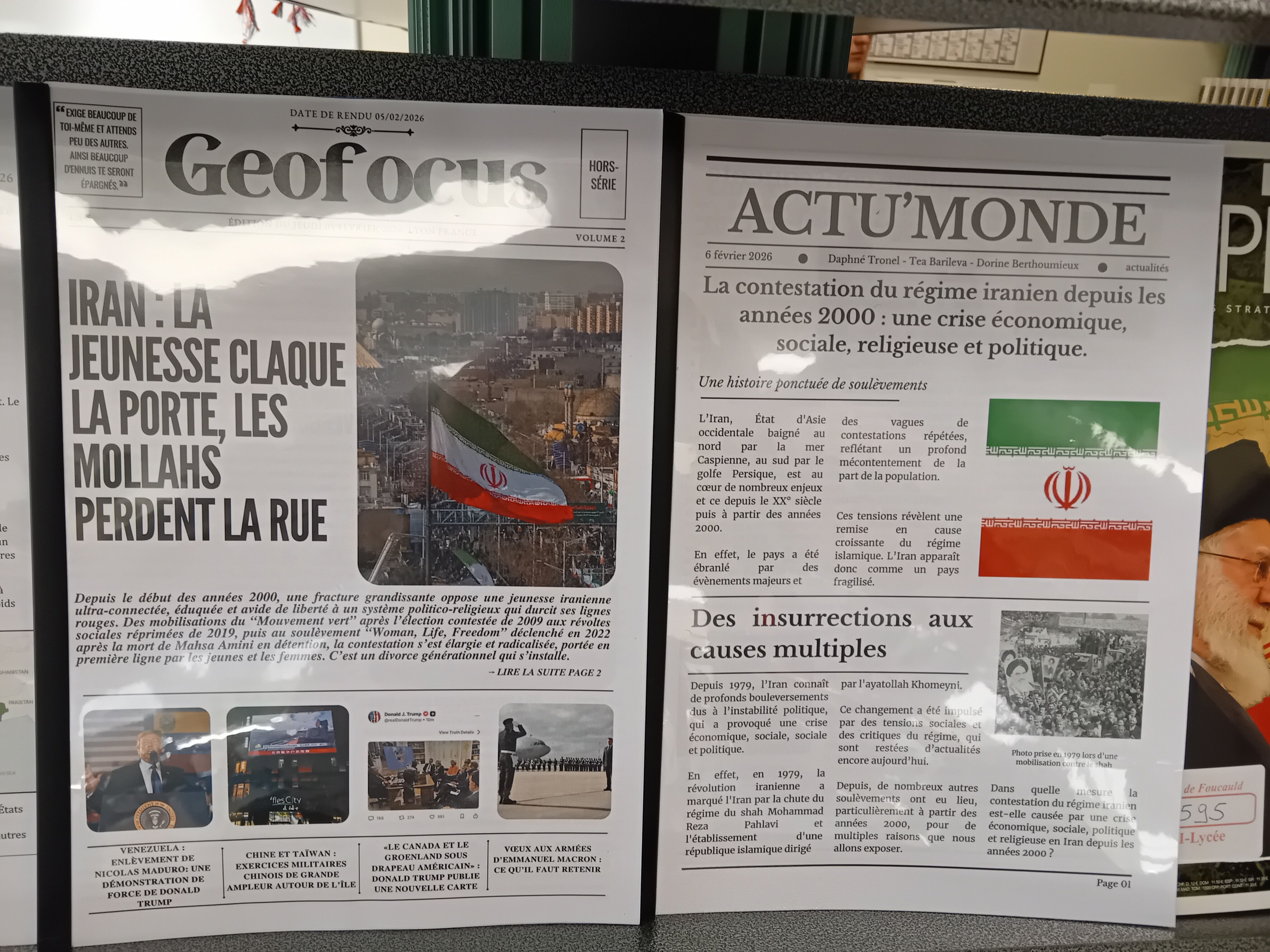 Dans le cadre d'un travail de classe sur ce thème d'actualité, les élèves de P2 et P6 suivant la spécialité HGGSP ont réalisé par petits groupes des articles sur différents sujets, suite à des recherches réalisées au CDI. A la croisée de plusieurs chapitres importants de leur programme (État et religion, la démocratie, les puissances), la question iranienne et la remise en cause du pouvoir des Mollahs, très médiatisées au moment où les élèves ont fait leur travail, sont des sujets d'étude passionnants.
