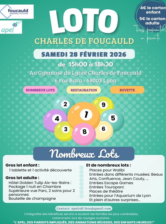 Comme chaque année, la communauté éducative de l'ensemble scolaire Charles de Foucauld se rassemble au cours d'un traditionnel LOTO organisé par l'Apel.